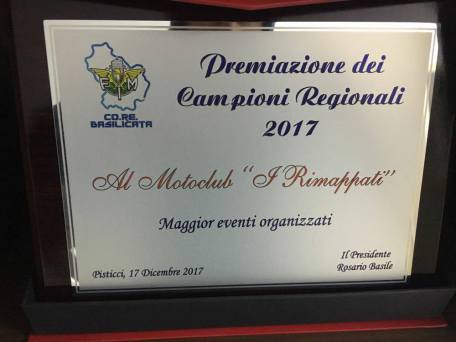 Il motoclub “I Rimappati” di Tursi, seguito dal presidente Gianpiero De Simone, in occasione della premiazione regionale dei campioni tenutasi a Pisticci domenica 17 dicembre ha ottenuto una serie importante di riconoscimenti per l’attività svolta nell’anno solare 2017.