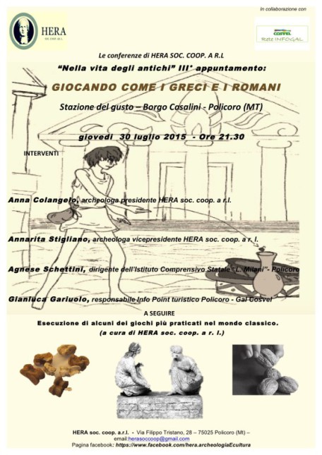 Ad introdurci nel mondo dei giochi al tempo greco e romano le archeologhe della Hera  Soc. Coop., Anna Colangelo e Annarita Stigliano, cui seguiranno gli interventi di Agnese Shettini, dirigente dell’Istituto Comprensivo Statale “L. Milani” di Policoro che ha aderito al progetto di didattica archeologica e, di Gianluca Gariuolo, responsabile dell’ Info-point Turistico di Policoro, che chiuderà la manifestazione.
