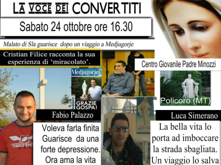 Si terrà sabato alle ore 16.30, nella sala conferenze del Centro giovanile “Padre Minozzi” di Policoro, l’evento “La Voce dei Convertiti”, momento di riflessione sul valore della fede cattolica attraverso la testimonianza di chi, grazie ad esperienze spirituali “forti”, ha potuto ritrovare nuova speranza e fiducia nella vita.