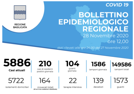 La task force regionale comunica che venerdì 27 novembre, sono stati processati 1.586 tamponi per la ricerca di contagio da Covid-19, di cui 221 (e fra questi 210 residenti in Basilicata) sono risultati positivi.