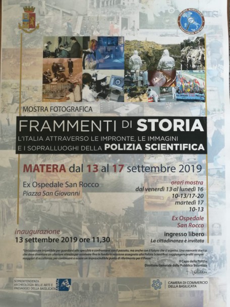 Dal 13 al 17 settembre, presso gli spazi espositivi della Soprintendenza Archeologica, Belle Arti e Paesaggio della Basilicata del Palazzo “ex Ospedale S. Rocco”, in piazza S. Giovanni a Matera, sarà allestita la mostra fotografica “Frammenti di Storia. L’Italia attraverso le impronte, le immagini e i sopralluoghi della Polizia Scientifica”.
