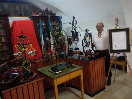 Per la mostra anche una specchiera sulla quale sono adagiate delle lumache, tante quante bastano a rendere l’idea di una famiglia. Per Salvatore sono animali silenziosi, docili, innocui, essenziali in questa vita frenetica. Tra le sue creazioni anche gigli africani, apribottiglie, segnalibri, campanacci, ed infine l’emblema della Francia: il gallo, dipinto di nero petrolio, segno di eleganza e forza, contrapposto a quel gallo dai colori arlecchini che per Salvatore incarna, ma in ferro, l’anima italiana.