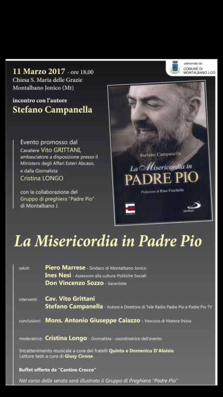 Tutto pronto per l’incontro con Stefano Campanella, per presentare il suo ultimo libro “La misericordia in Padre Pio” (Edizioni Padre Pio da Pietrelcina – Edizioni San Pio), sabato 11 marzo, alle ore 18.00, presso la parrocchia Santa Maria delle Grazie, a Montalbano Jonico.