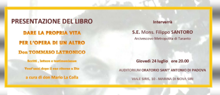 Giovedì 24 Luglio, alle ore 20.00, nell’uditorium Oratorio Viale Siris 10 Nova Siri Marina, monsignor Filippo Santoro, Arcivescovo Metropolita di Taranto parteciperà alla presentazione del libro ”Dare la propria vita per l’opera di un Altro – Don Tommaso Latronico Scritti, Lettere e Testimonianze vent’anni dopo il suo ritorno a Dio” a cura di Don Mario La Colla.