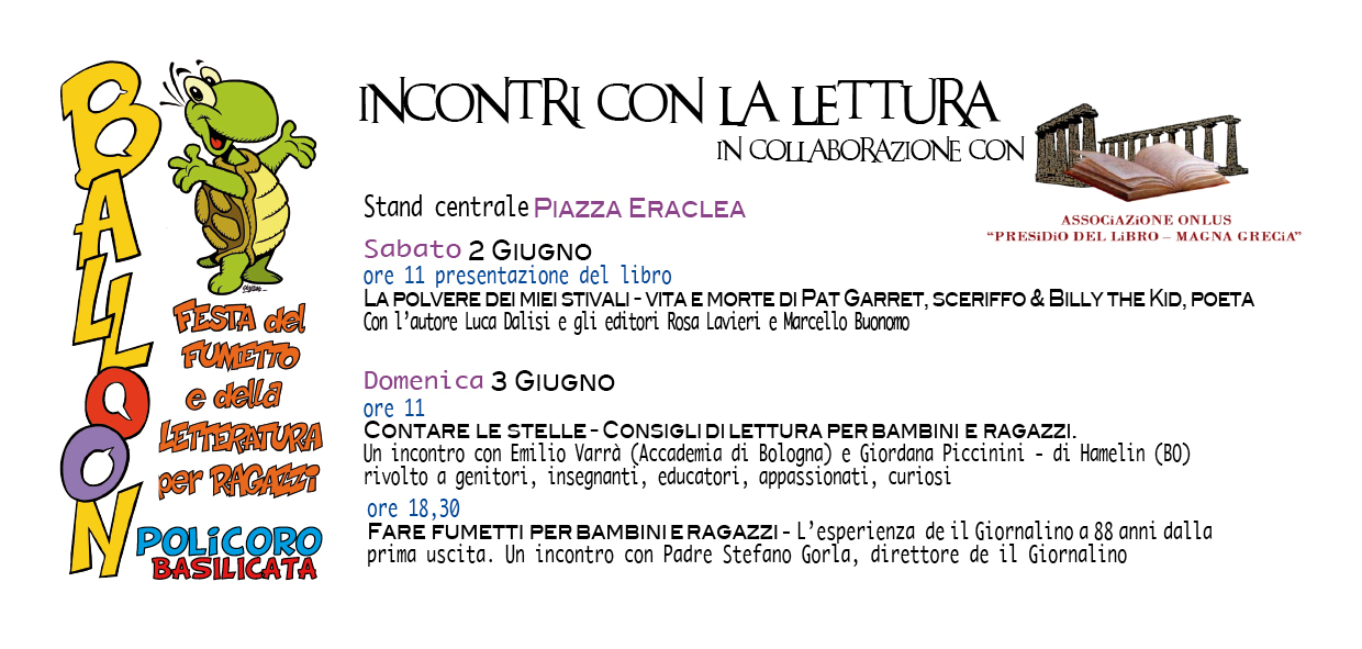 Balloon, la prima Festa del Fumetto e della Letteratura per Ragazzi a Policoro, in programma il 2 e 3 Giugno prossimi, proporrà in Piazza Eraclea interessanti “Incontri con la lettura” in collaborazione con il “Presidio del Libro-Magna Grecia” di Policoro.
