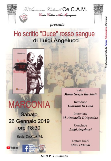 Sabato 26 Gennaio, a Marconia, alle ore 18:30, presso la sede dell’Associazione Culturale CE.C.A.M., sarà presentato il libro: Ho scritto “Duce”rosso sangue di Luigi Angelucci; edito dalla Youcanprint di Tricase nel dicembre del 2017.