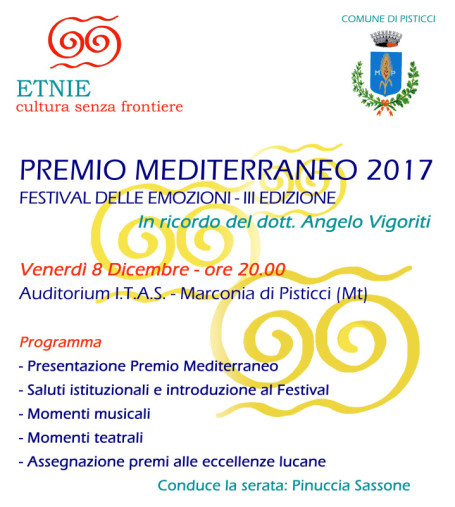 Venerdì 8 Dicembre, a partire dalle ore 20.00, presso l’Auditorium dell’Istituto Agrario di Marconia di Pisticci, l’associazione “Etnie – Cultura senza Frontiere” presenta “Premio Mediterraneo – Festival delle emozioni”.